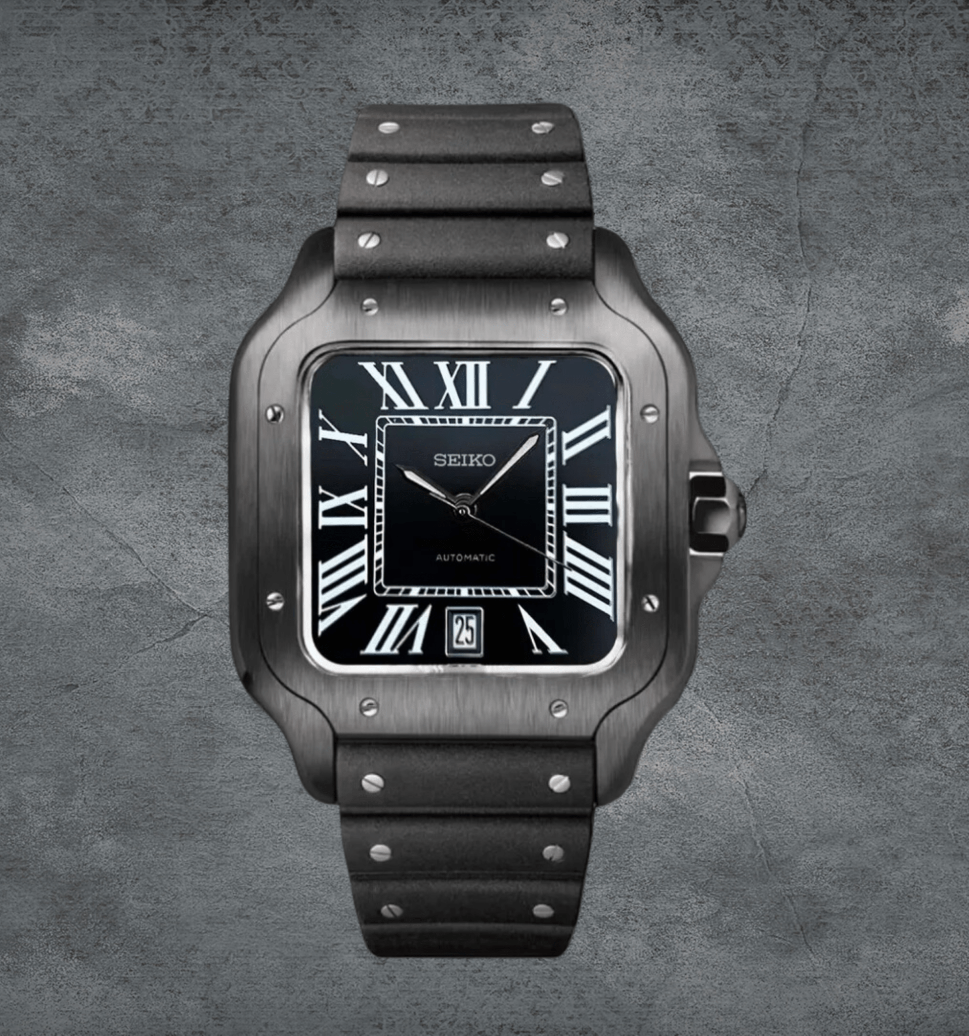 Introducing the Seiko Mod Santos ADLC, a custom Seiko NH35 Automatic Watch inspired by the iconic “Santos” design. This piece combines elegance and precision, featuring a Black Roman aftermarket dial encased in a 38mm stainless steel frame. The transparent back piece allows a glimpse into the intricate automatic movement, making it a standout choice for watch aficionados.