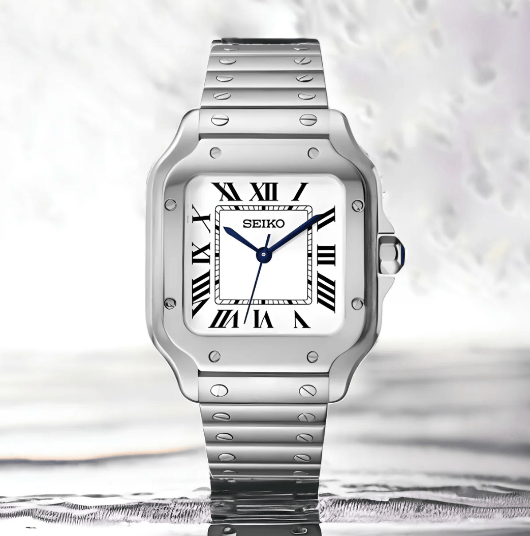 Introducing the Seiko Mod Santos Classic, a custom Seiko NH35 Automatic Watch inspired by the iconic “Santos” design. This piece combines elegance and precision, featuring a White Roman aftermarket dial encased in a 38mm stainless steel frame. The transparent back piece allows a glimpse into the intricate automatic movement, making it a standout choice for watch aficionados.