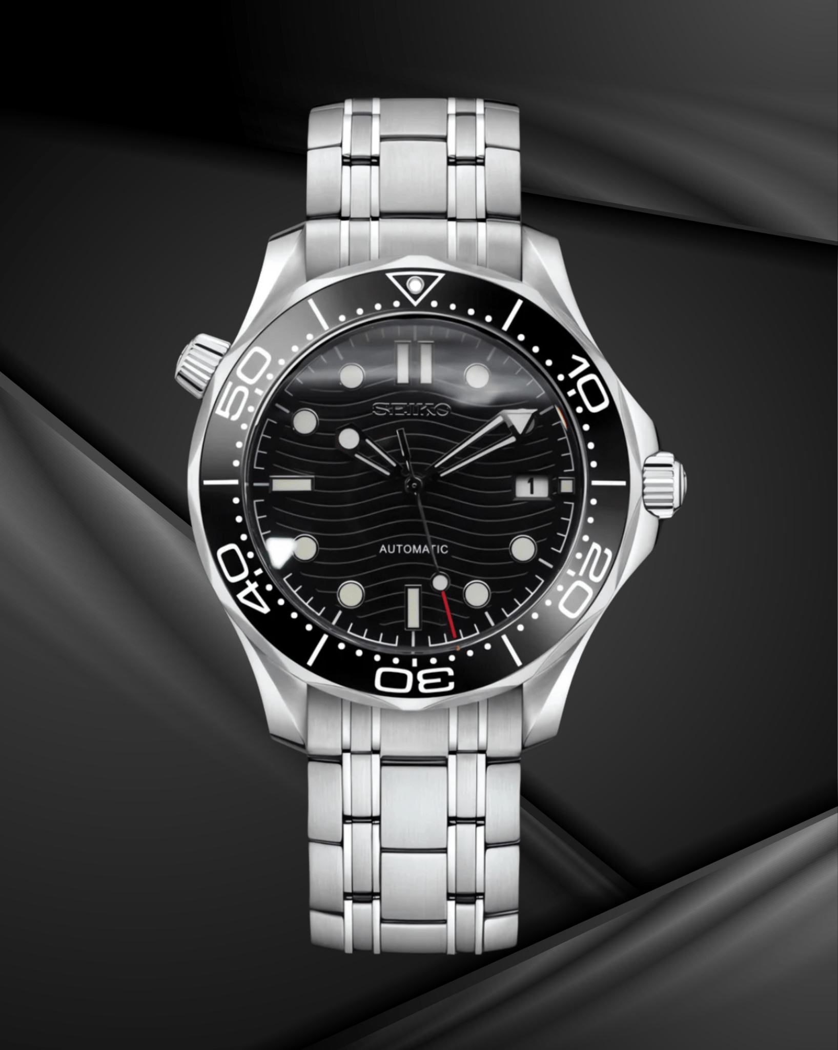 Elevate your style with the Seiko Mod Seamaster - Black, a custom NH35 Automatic Watch, inspired by the iconic Seamaster design. This unique timepiece features a Black dial, encased in a 40mm stainless steel frame, offering a blend of elegance and precision for watch enthusiasts.